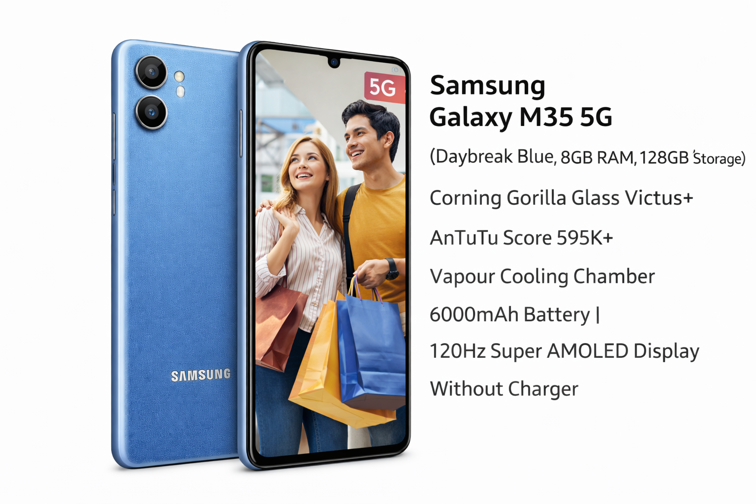 Samsung Galaxy M35 5G (Daybreak Blue,8GB RAM,128GB Storage)| Corning Gorilla Glass Victus+| AnTuTu Score 595K+ | Vapour Cooling Chamber | 6000mAh Battery | 120Hz Super AMOLED Display| Without Charger